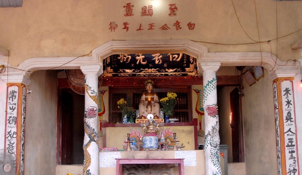 Tại ban thờ trang trọng nhất giữa hậu cung đặt tượng nữ thần Bạch Y công chúa. Phía trên bức tượng là bức đại tự 4 chữ lớn: “Bạch Y Tiên Cô”, phía dưới có hàng chữ “Hồ Thị Hi, Lê Triều sắc thủ thượng đẳng thần”.